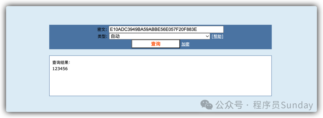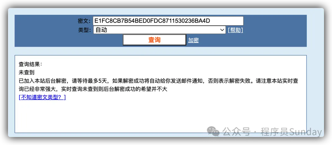 比如:原密码为123456,在这个密码基础上增加固定字符“LGD_Sunday!”得到的结果就是:“LGD_Sunday!123456”,然后用该字符进行md5加密,结果是:E1FC8CB7B54BED0FDC8711530236BA4D,此时尝试解密,会发现解密失败。